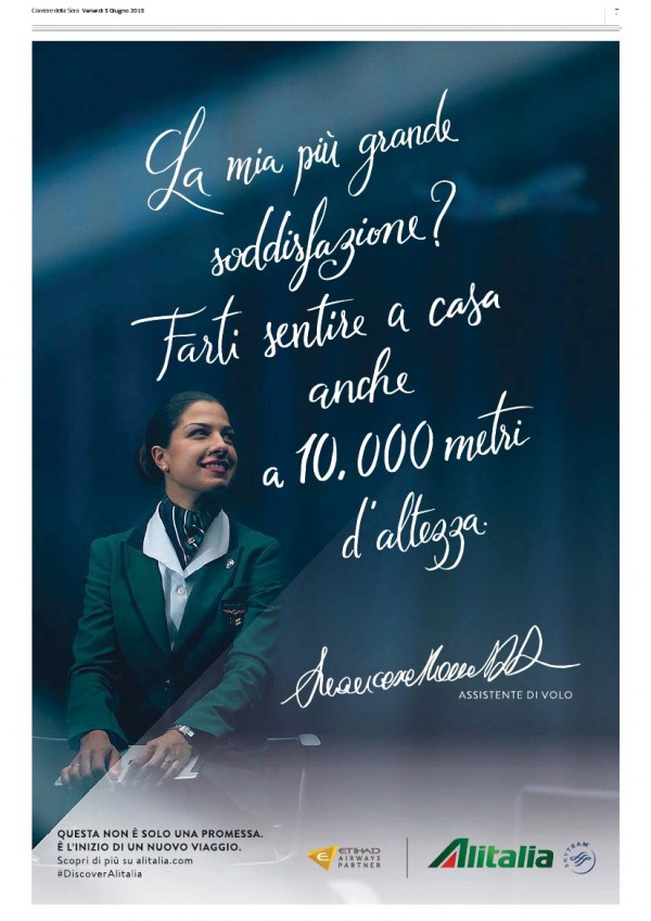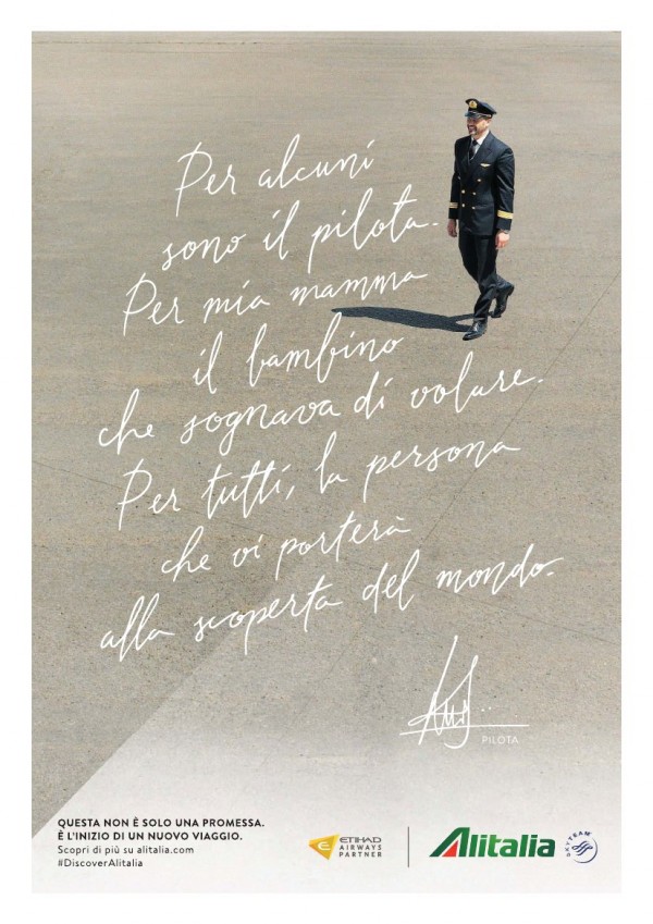 “La mia pi๠grande soddisfazione? Farti sentire a casa anche a 10.000 metri d’altezza“ e la frase dell’assistente di volo; “Per alcuni sono il pilota; per mia mamma il bambino che sognava di volare; per tutti la persona che vi porterà alla scoperta del mondo“, èinvece la frase del capitano di bordo. E queste di seguito sono le due immagini scelte per veicolare il messaggio.